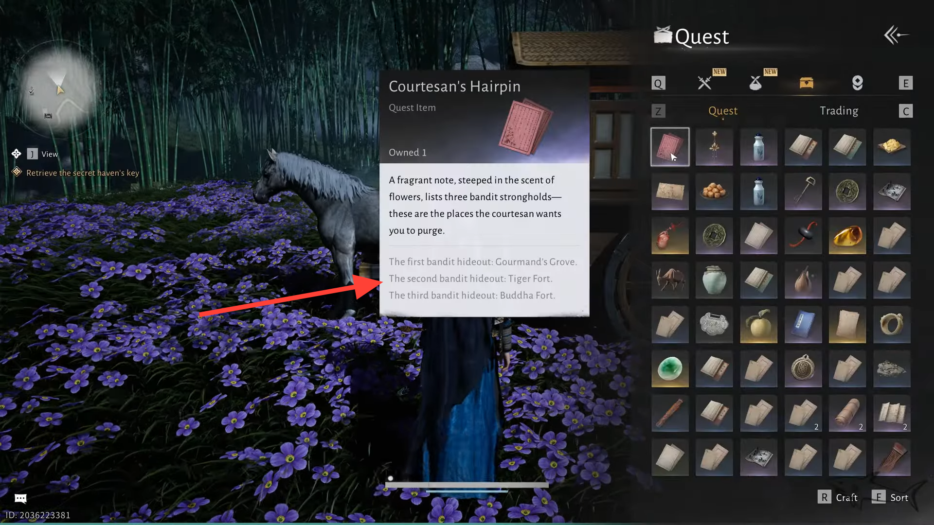 Step 2: During the dialogue, she explains that she wants to see flowers but bandits are blocking the way. At the end of the conversation she gives you a quest item, a letter that lists three outposts she wants cleared.