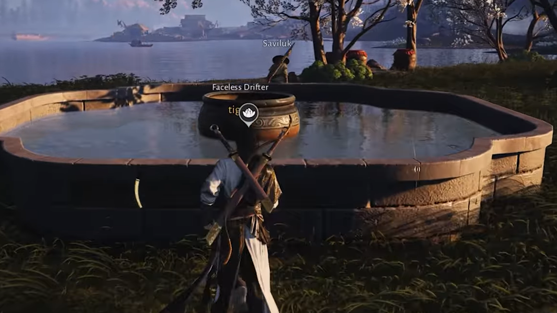 Step 3: Find the fountain on the western lakeshore. The Merit Pool is a large circular fountain on the coast, near the water’s edge. In Multiplayer mode, an NPC named Le Yuan stands beside it.