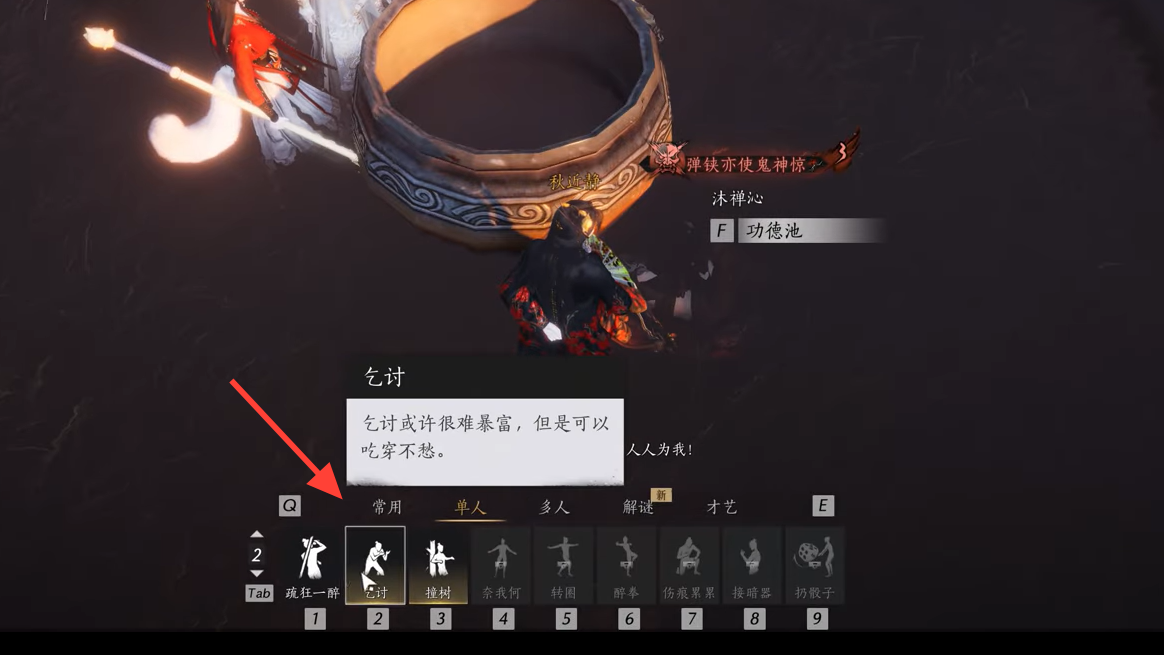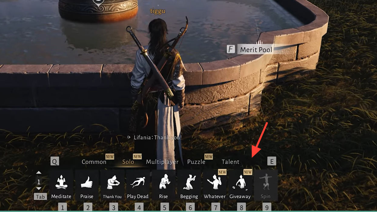 Step 2: Verify that Giveaway is unlocked. Open the emote menu with F2 (or the controller shortcut), go to the Solo tab, and look for Giveaway by name. If it is not listed, return to Le Yuan at the Merit Pool and repeat the unlock steps.
