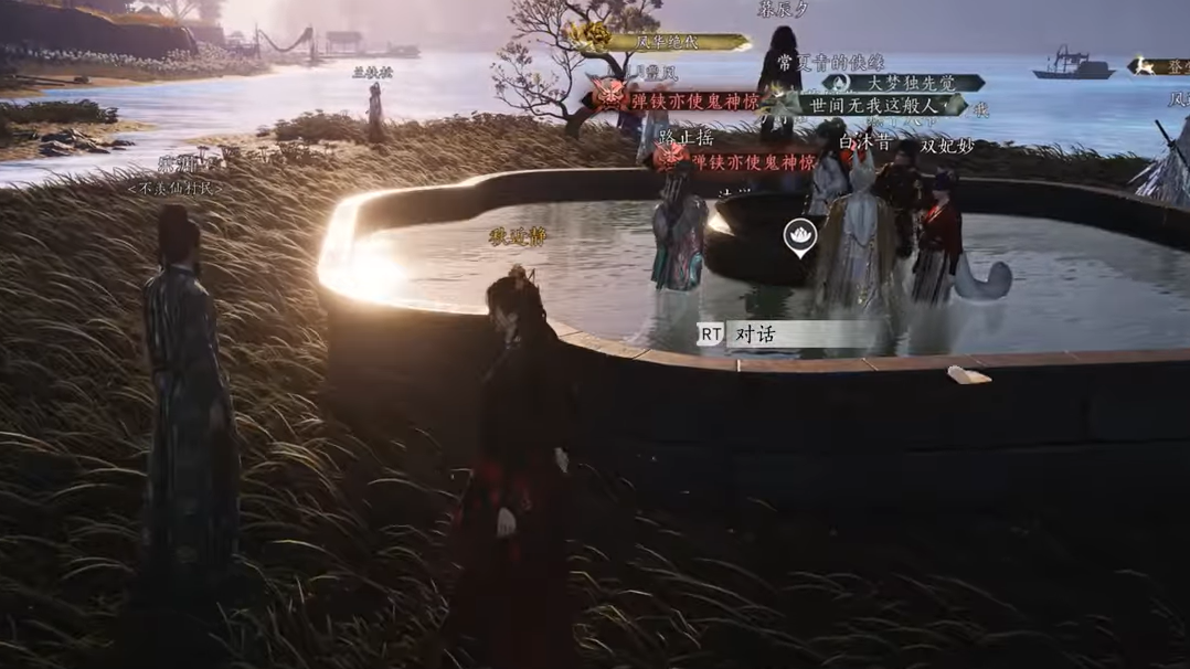 Step 3: Find the fountain on the western lakeshore. The Merit Pool is a large circular fountain on the coast, near the water’s edge. In Multiplayer mode, an NPC named Le Yuan stands beside it.