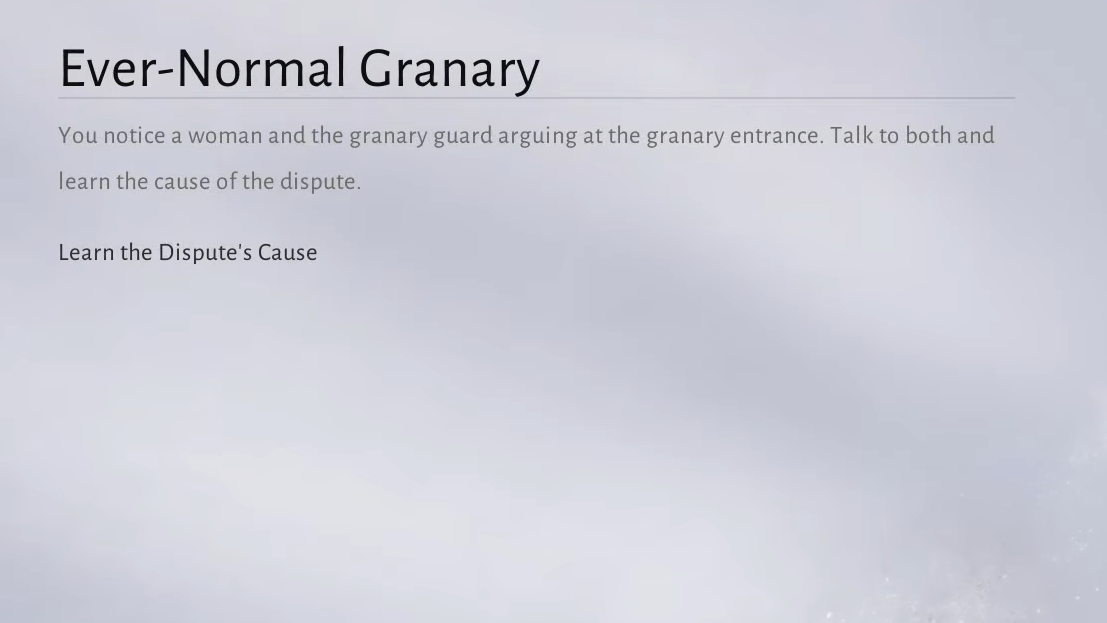 Step 1: Travel to the Granary of Plenty region in Kaifeng and speak to the Wayfarer near the Ever-Normal Granary exterior dispute to track the Ever-Normal Granary quest.