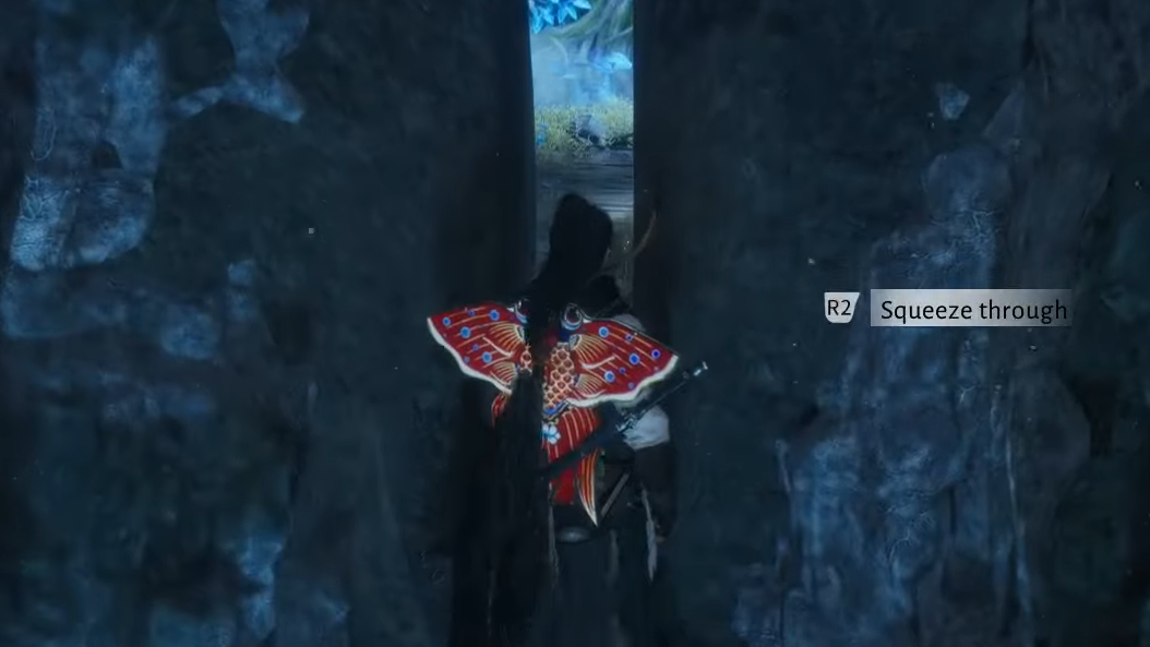 Step 1: Follow the mine tunnel until you reach a blue-lit area and a narrow crevice. Slip through to the other side to reach a dead-end blocked by vines.