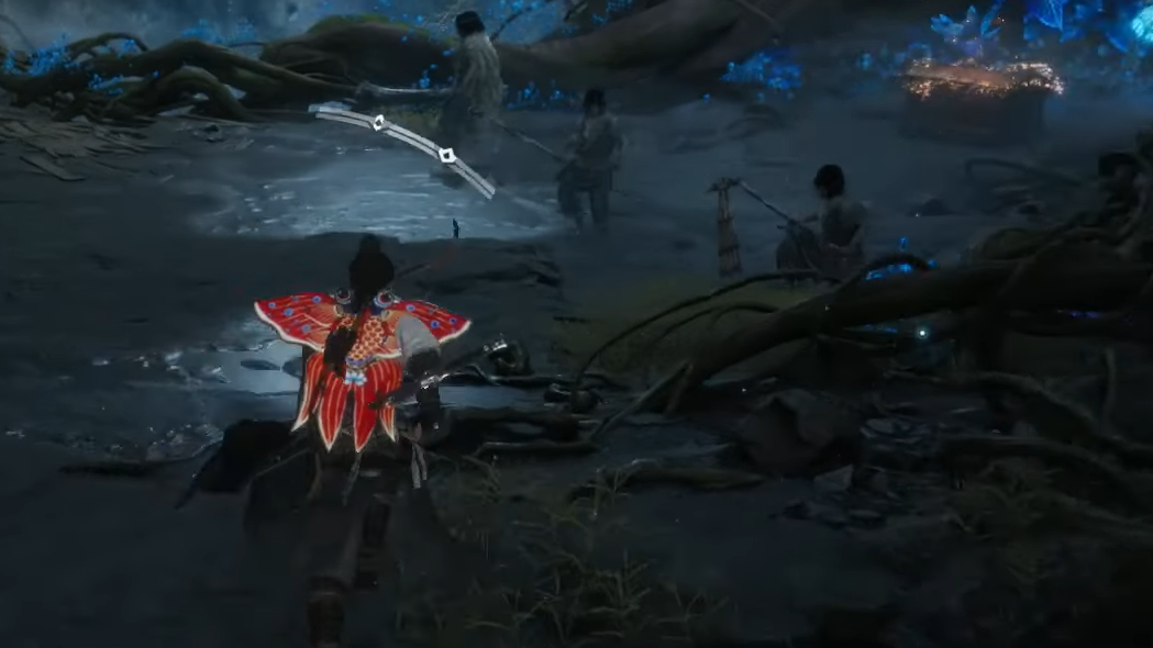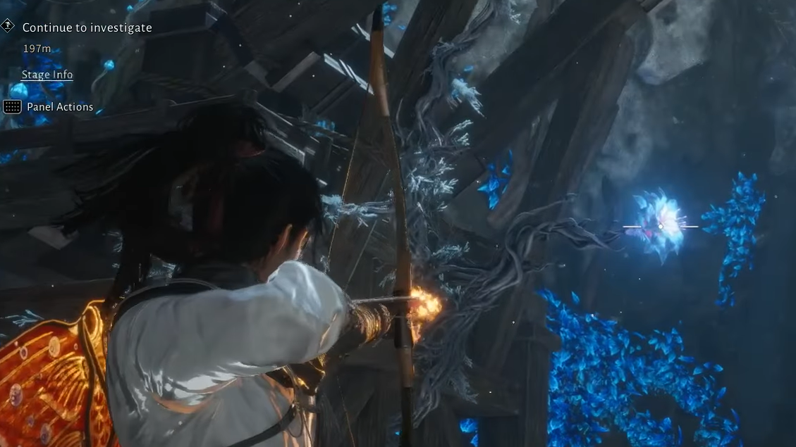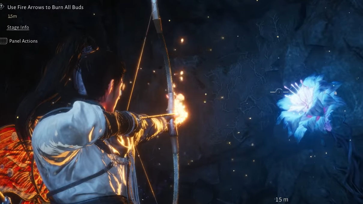 Step 1: Reach the edge of the large chasm and pick up the nearby fire arrows. Face left and burn the Dawn-to-Dusk Blossoms that anchor the first set of vines. A leap icon will appear on the rock surface once the vines are gone.