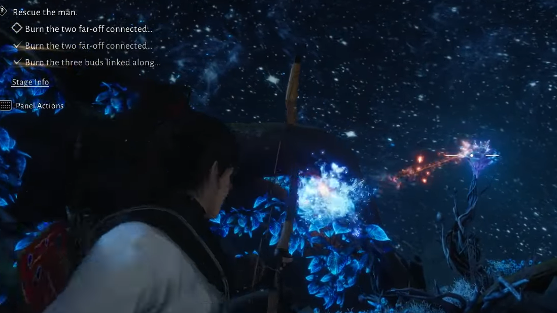 Later in the complex, the quest returns to a familiar objective: save the man. This time, the target is trapped behind a more layered Dawn-to-Dusk Blossoms puzzle where buds regrow if you do not find them all.