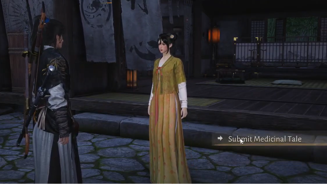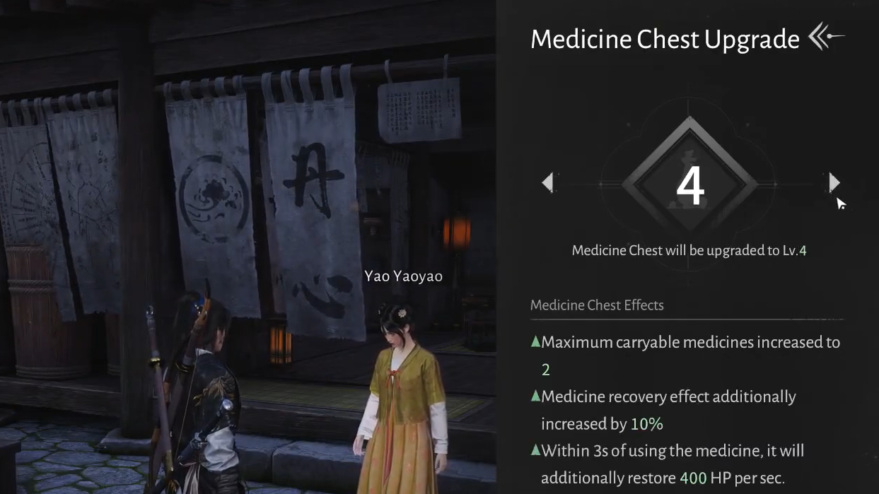 Step 2: Choose the Submit Medicinal Tale option when talking to Yaoyao. This opens the Medicine Chest upgrade screen, showing its current rank, how many charges you can carry, and any bonus effects.