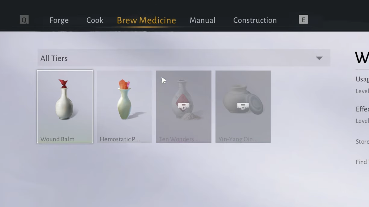 Step 1: Open Brew Medicine and select the Wound Balm recipe. If it is locked, an Unlock button appears in the bottom‑right corner of the screen.