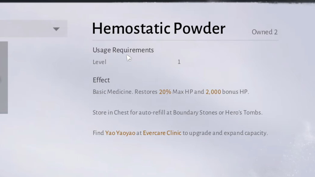 - Heaven’s Pier (Qinghe): The peddler Xiong Da sells the basic Hemostatic Powder healing item.