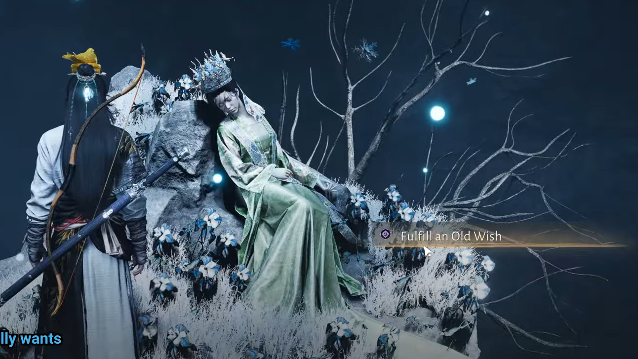 Step 3: Interact with her again, and this time select the Moonlit Flower. Confirm the offering as you did with the blade. After both offerings are accepted, the objective to “find what the Lunar Goddess really wants” updates, and a final cutscene triggers.
