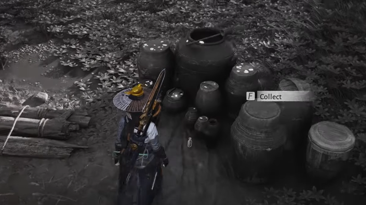 Step 3: Once the area is safe enough, look near the cooking pot. The first vial lies on or beside some jars close to the fire. Interact with it to collect the item and update the quest objective.