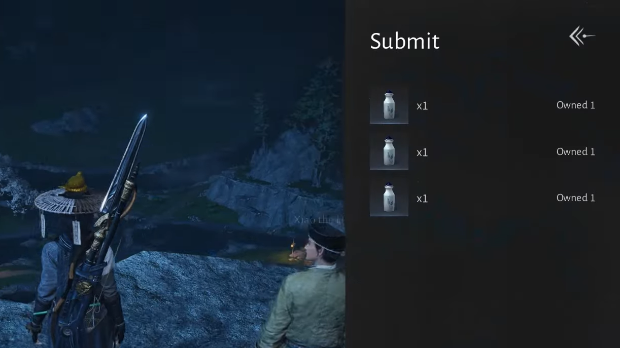 Step 1: Go back to Xiao’s cliffside location north of Crimson Cliff and interact with him again. The dialogue prompt includes a Give option once you are in front of him with the vials collected.
