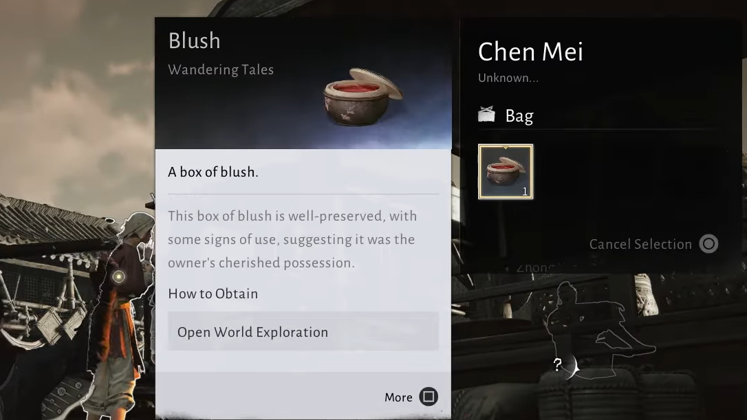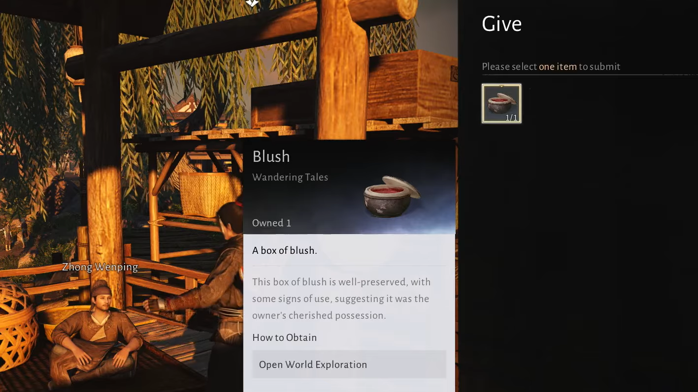 Once this confrontation is done, you can engage properly with Zhong Wenping and the game will flag Blush as the item you need to obtain.