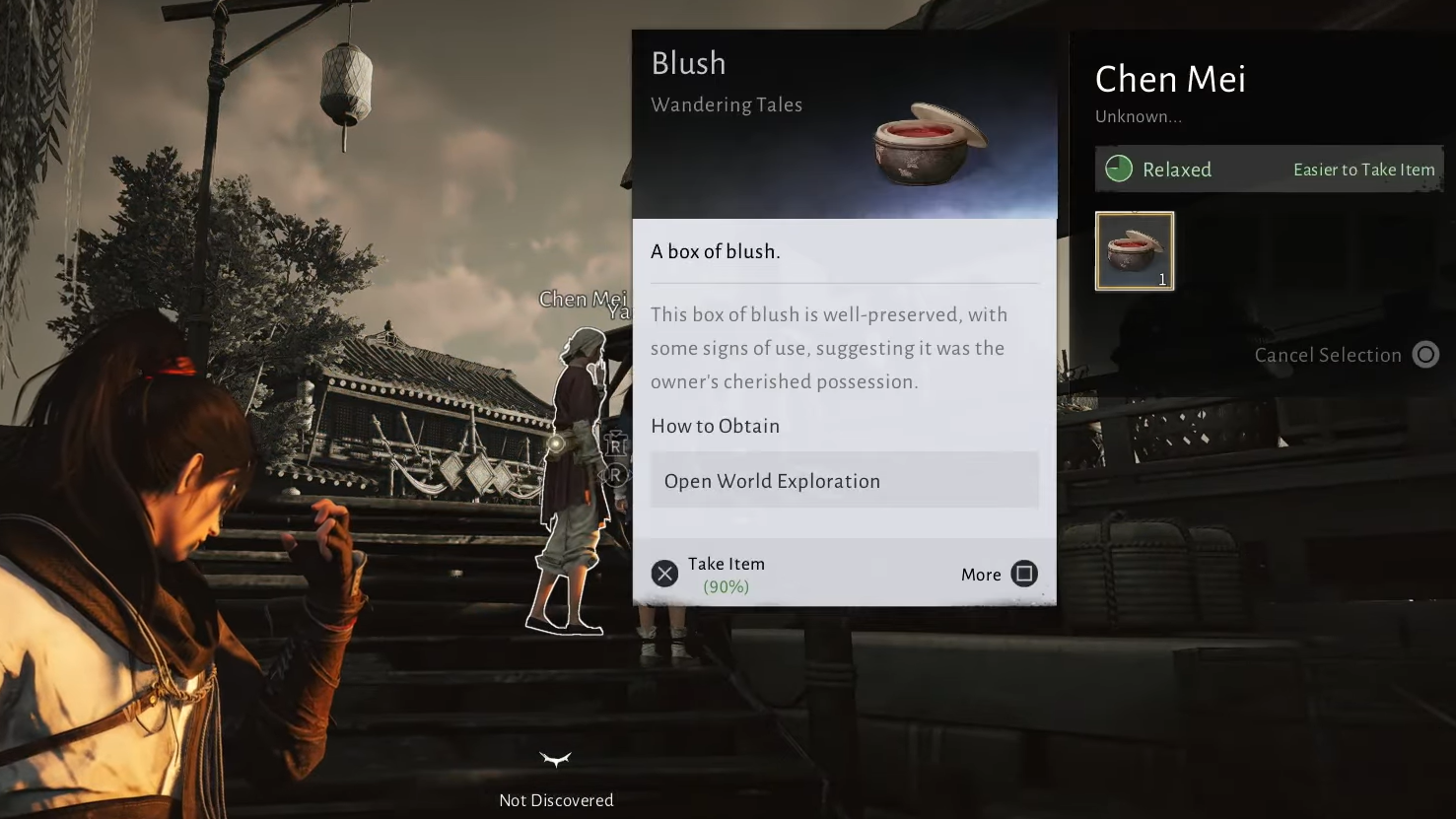 | Acquire Blush | Chen Mei, woman in red behind Zhong Wenping | Use Celestial Seize from behind, pick the Blush item in the menu. |