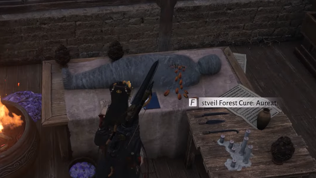 Step 3: Move deeper into the room until you spot a mummified body near the hearth. The Mistveil Forest Cure item is placed on the ground or surface right next to that body.
