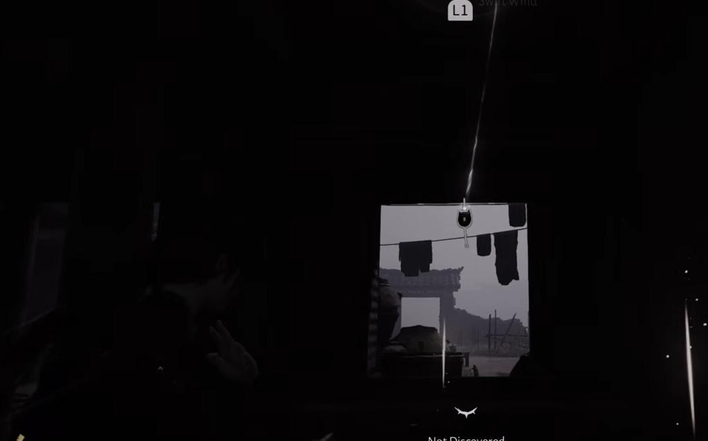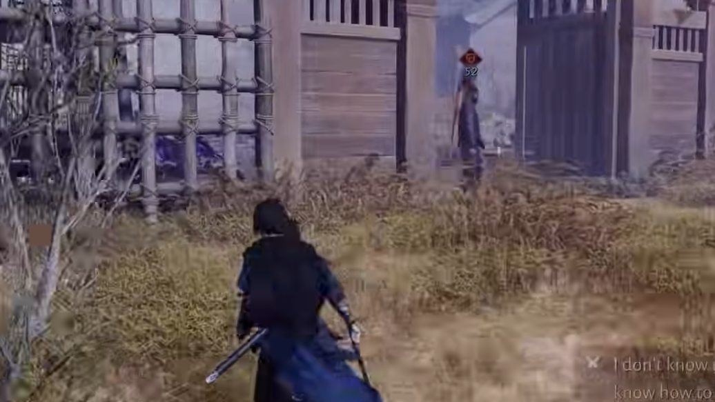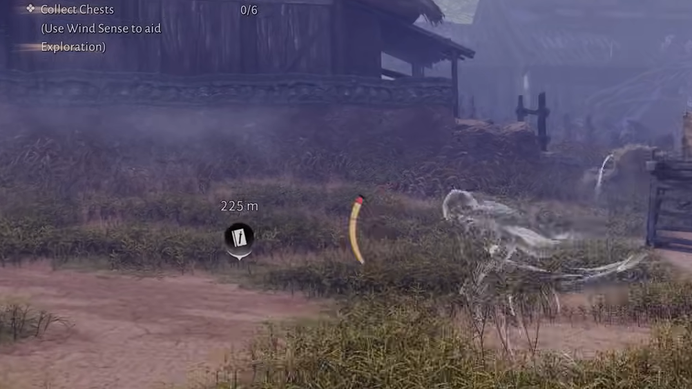 Step 2: In the main yard, activate Wind Sense (V) to see enemy vision cones and plan a stealthy route. Head towards the vines growing on the building that leads up to the second floor rather than confronting guards at ground level.