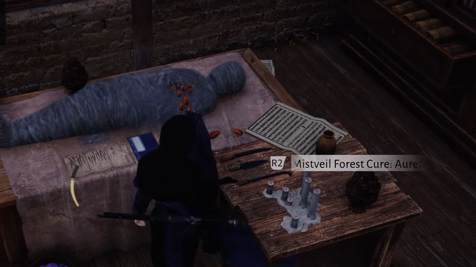 Step 4: Inside the central hut, look for a table beside a mummified body. On this table lies the Aureate Pavilion Mistveil Forest cure; interact with it to collect the final cure book. You can then leave the outpost without clearing the encounter or spending any Energy.