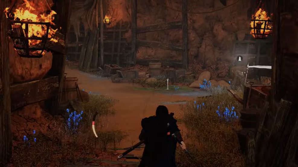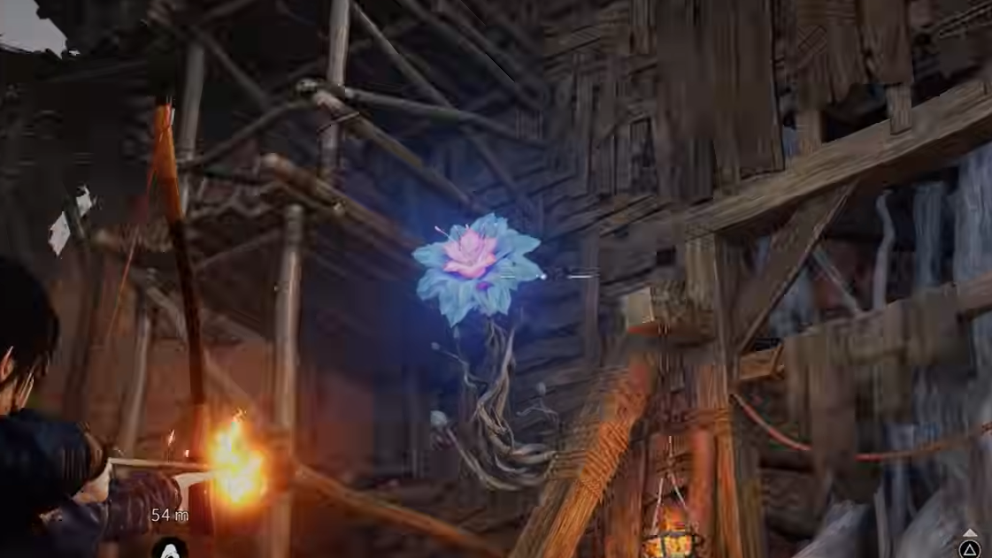 Step 2: Equip Fire Arrows and target the large toxin flowers covering the entrance ahead. Burning these Dawn-to-Dusk blooms clears the blockage and allows you to continue further into the corrupted section of the forest.