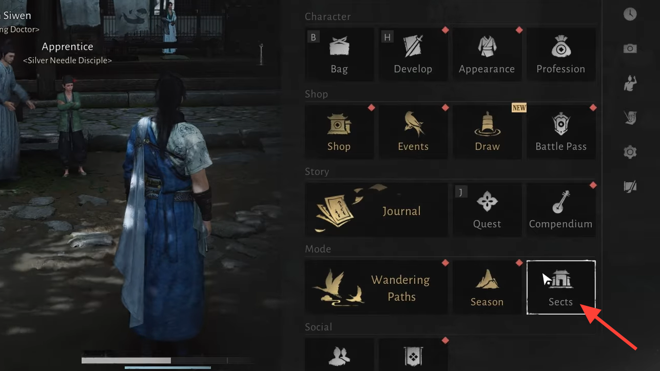 Step 1: Open the start menu and select Sects. This takes you to your current sect’s page, where membership actions live.