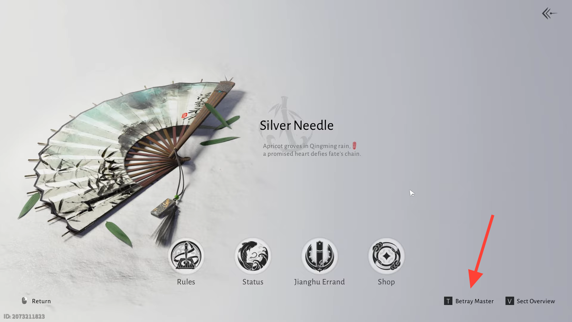 Step 2: Select Betray Master (shown in the bottom-right of the sect screen). This begins the leave process immediately.