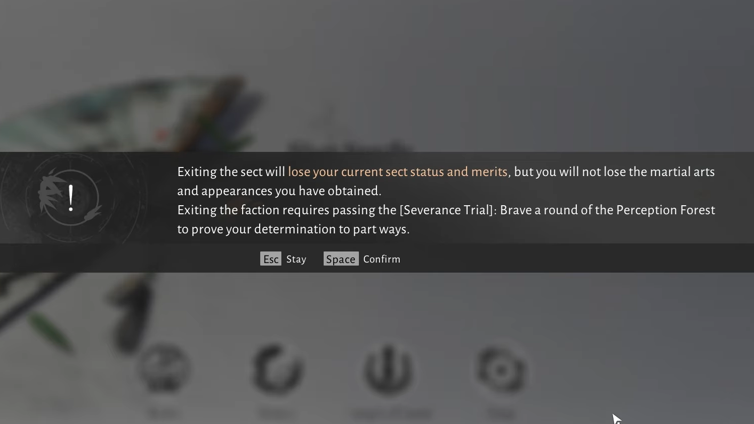 Leaving is initiated from the in-game sect interface. The core flow is the same across sects that use Severance Trials.
