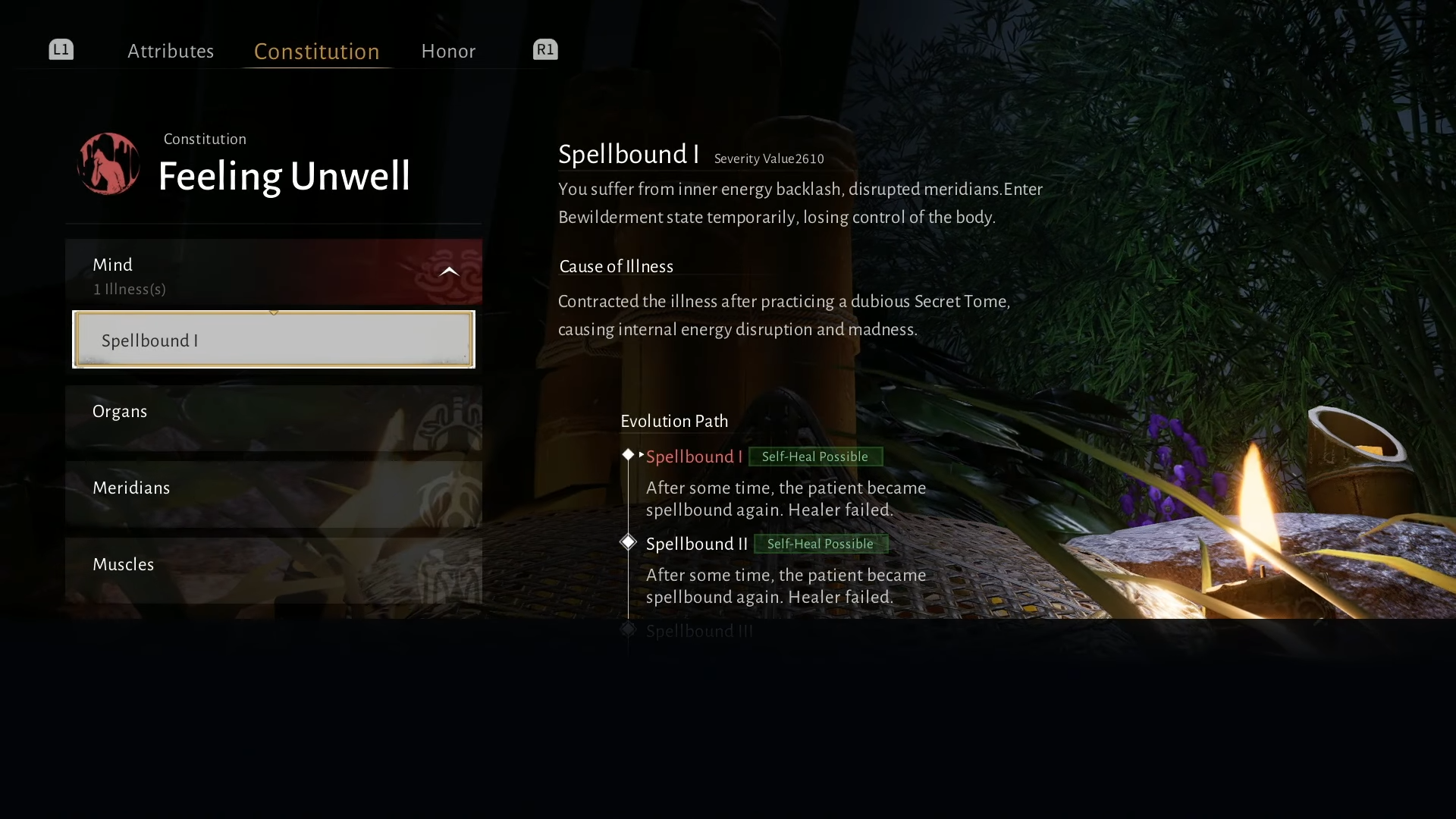 - Switch to the Constitution tab to see illnesses affecting Mind, Organs, Meridians, or Muscles.
