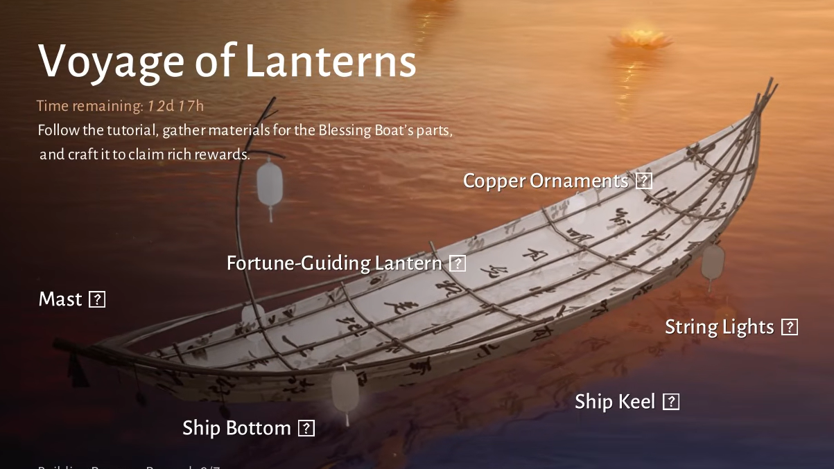 The event uses a fixed set of crafting materials required for building lantern boat components. Each piece you construct consumes a combination of these items.