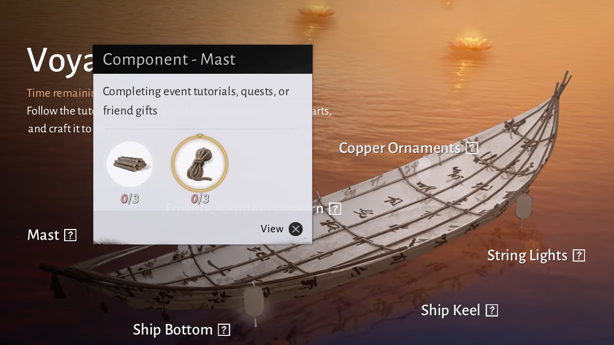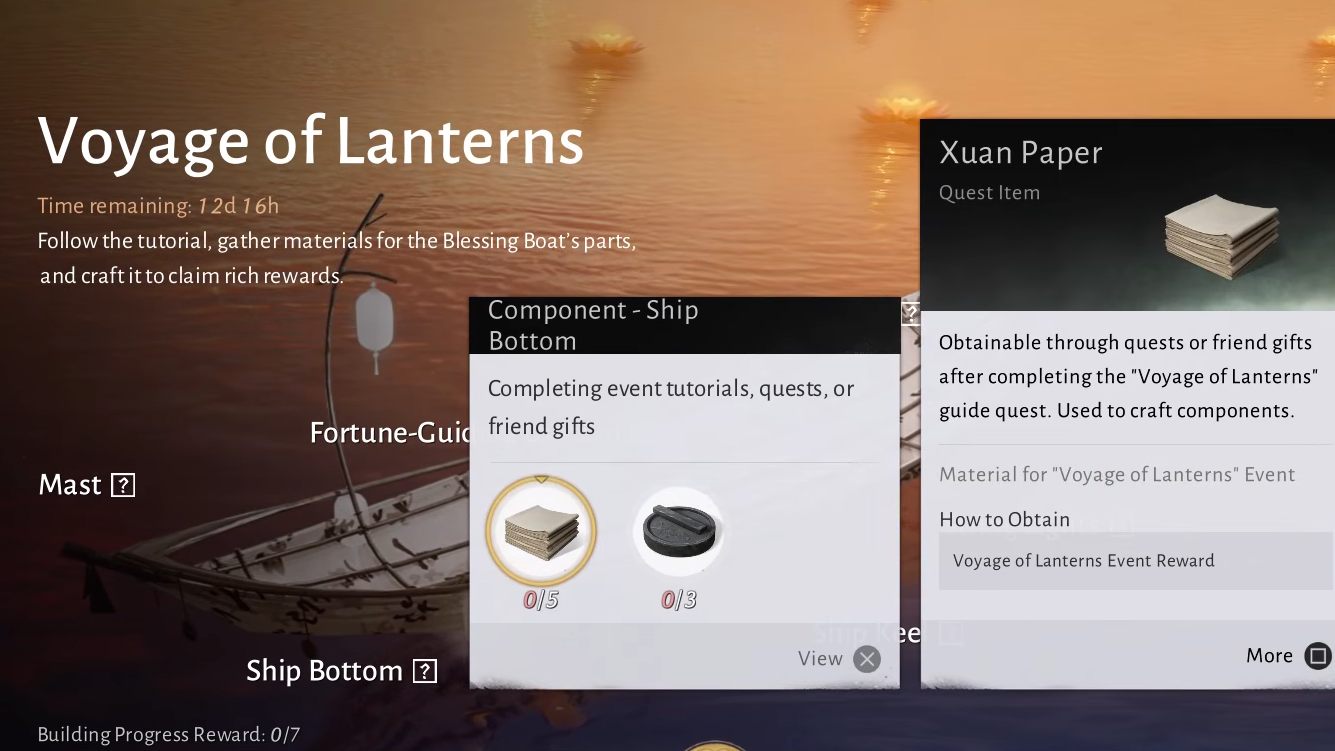 Material acquisition begins only after the event setup step is complete. The lantern boat hull must be placed first. When you speak to the event NPC again after placing the hull, the event menu updates and activates the material drop system.