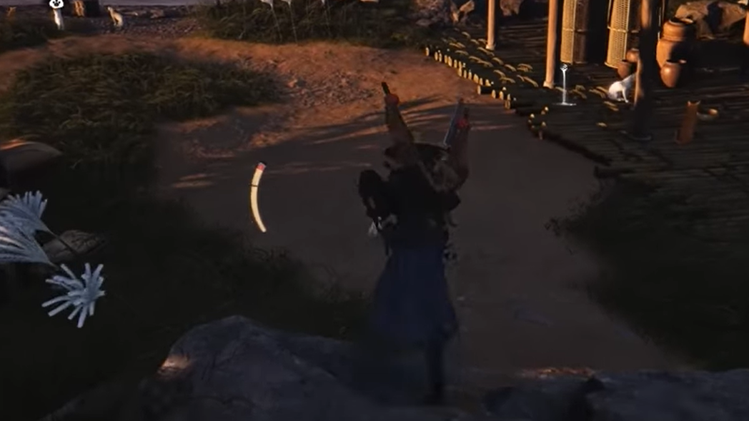 Step 2: From the beggar’s spot, walk west through the village. Under a large tree that looks like a memorial site, there is a spear stuck into the ground. This spear is the “gun” he’s referring to.
