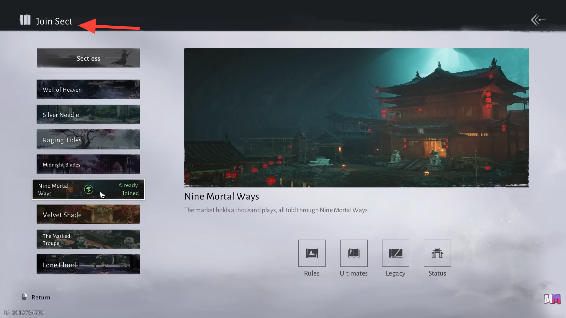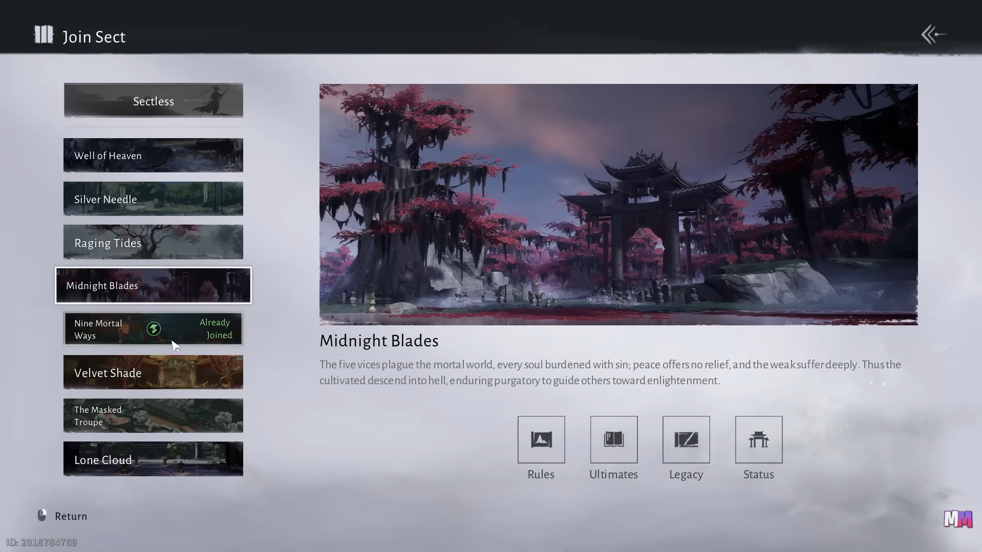 On launch, that full flow exists only for Well of Heaven, Silver Needle, Midnight Blades, and Nine Mortal Ways. Velvet Shade, Inkbound Order, Mohist Hill, The Masked Troupe, Hollow Vale, Lone Cloud, and Raging Tides are visible in the interface but explicitly flagged as “unavailable” and lack a functional join path.