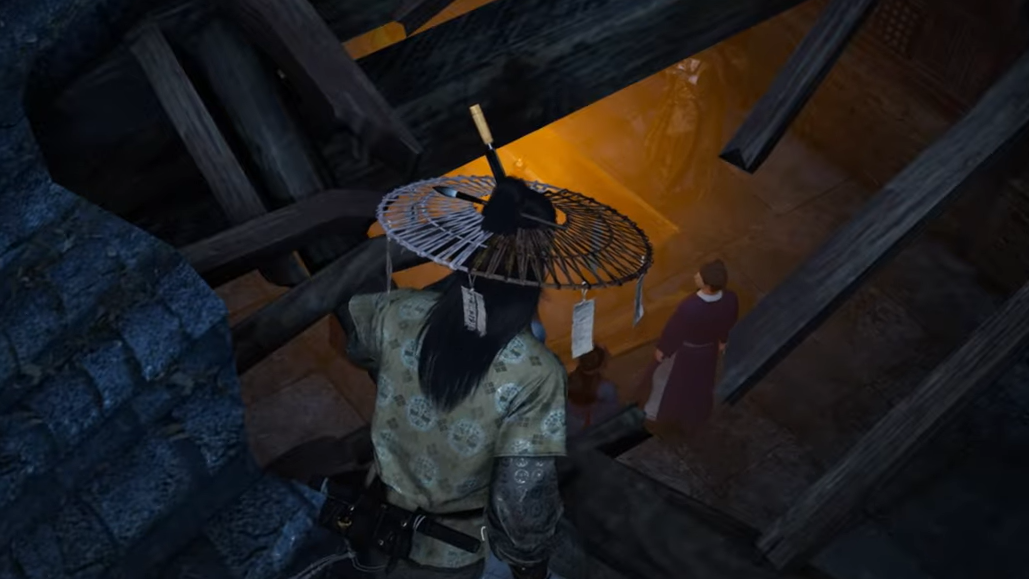 Step 1: Return to the village at night. Follow the on-screen marker to leap onto the rooftops and move toward a specific roof with a hole. Getting close enough triggers a cutscene where you spy on the meeting held inside.