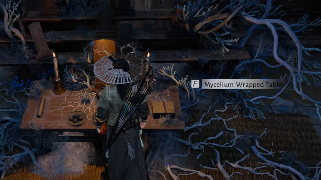 Step 1: Inside the shrine, examine the tablets. There are tablets on the right and left, but the important one is the center tablet wrapped in mycelium. Interacting with this mycelium-covered tablet pulls you into a vision-like sequence.