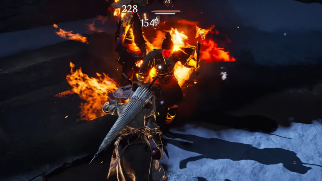 Step 3: Once the adds are gone, commit to He Yuezhi. His move set leans on broad swings, a charged rush, and a jumping attack. Parrying his charge and jump is the safest way to avoid heavy damage and to open him up to counters. Fast, pressure-heavy weapon sets like twinblades can keep him staggered for long stretches.