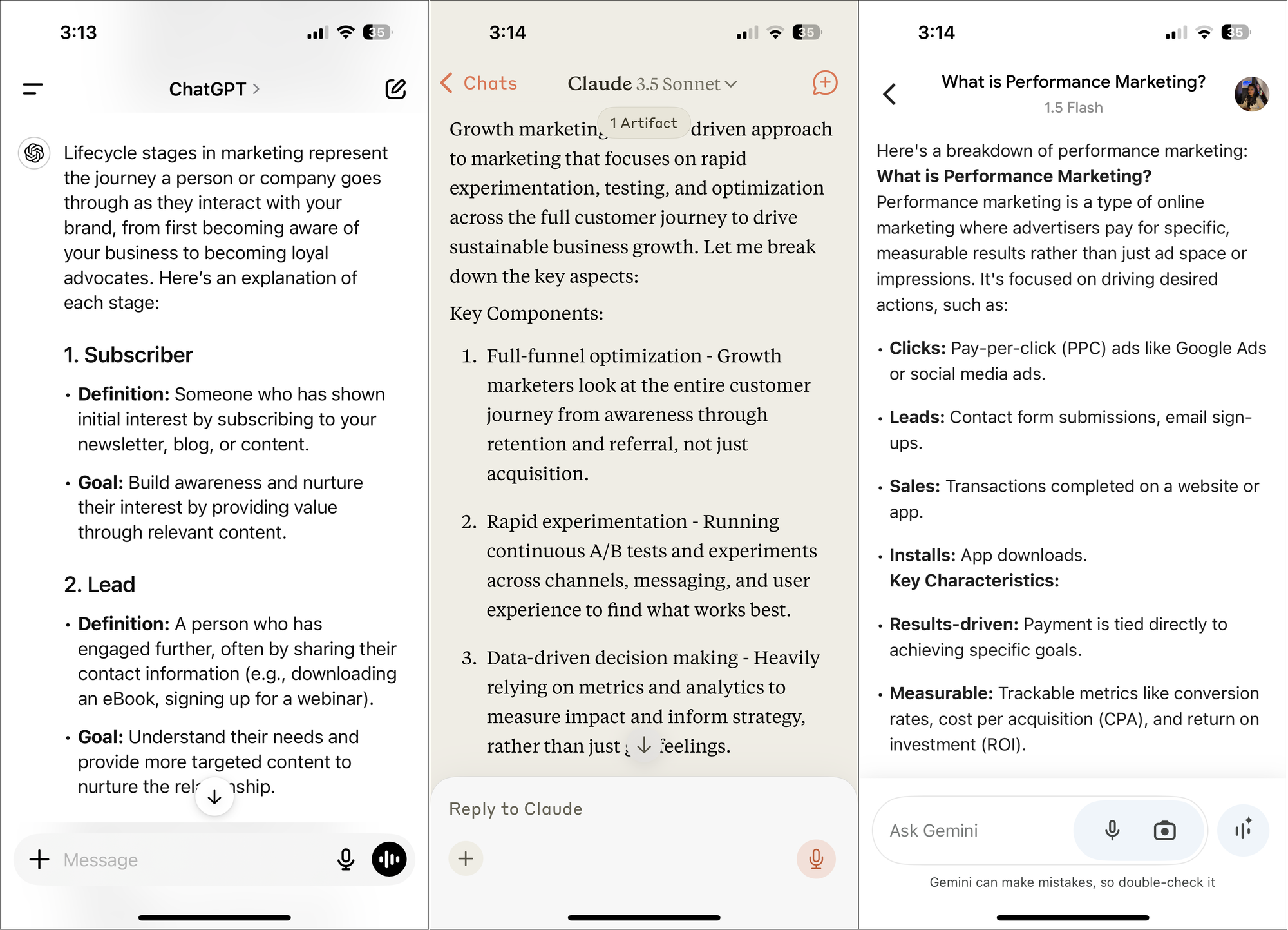 - Gemini - The text is organized in bullet points. It also includes bold text and occasional images (which none of the other apps do) to enhance responses. However, the smaller font size detracts from readability, especially on mobile devices.