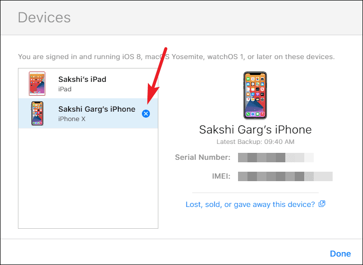 Another dialog box will open, listing your devices. Click the 'Remove device' (x) icon on the right of the device to remove it and click 'Done'.