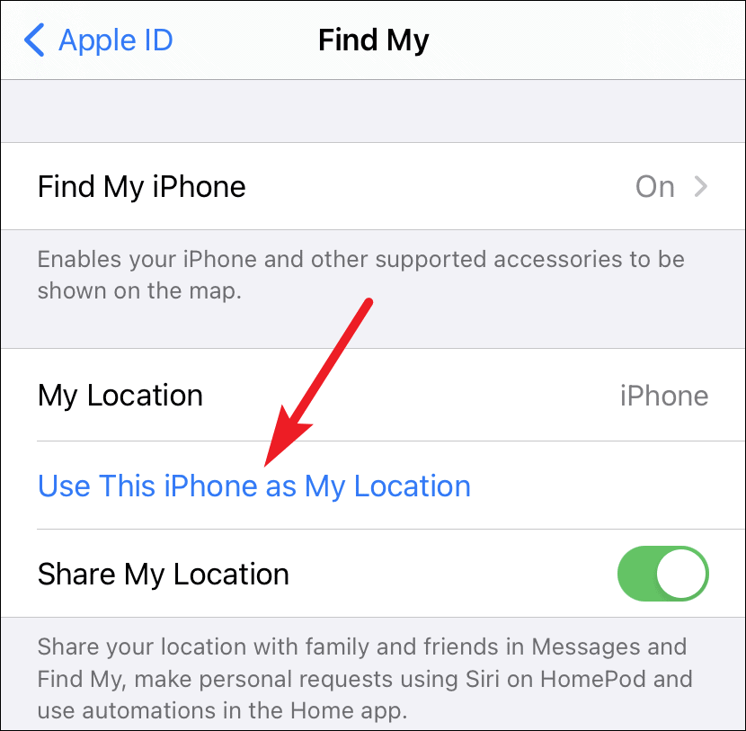 Go to your Apple ID card again from the device you want to share the location from. Then, tap 'Find My'. In 'Find My' settings, you'll see which device the location is being shared from. Tap the Use This iPhone as My Location' option.