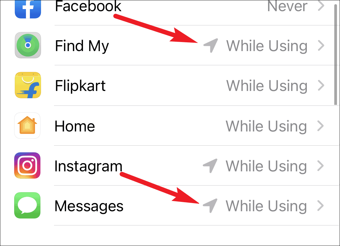 Also, scroll down to the list of apps and make sure that both 'Find My' and 'Messages' can access your location. If either of them displays anything other than 'While Using', open it and change the setting.