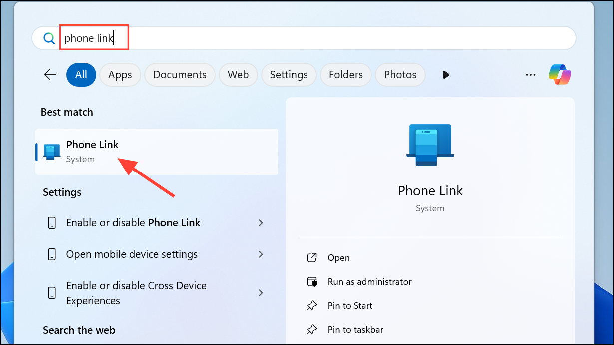 Step 1: Launch the Phone Link app by typing "Phone Link" into the Windows search bar and selecting the app.