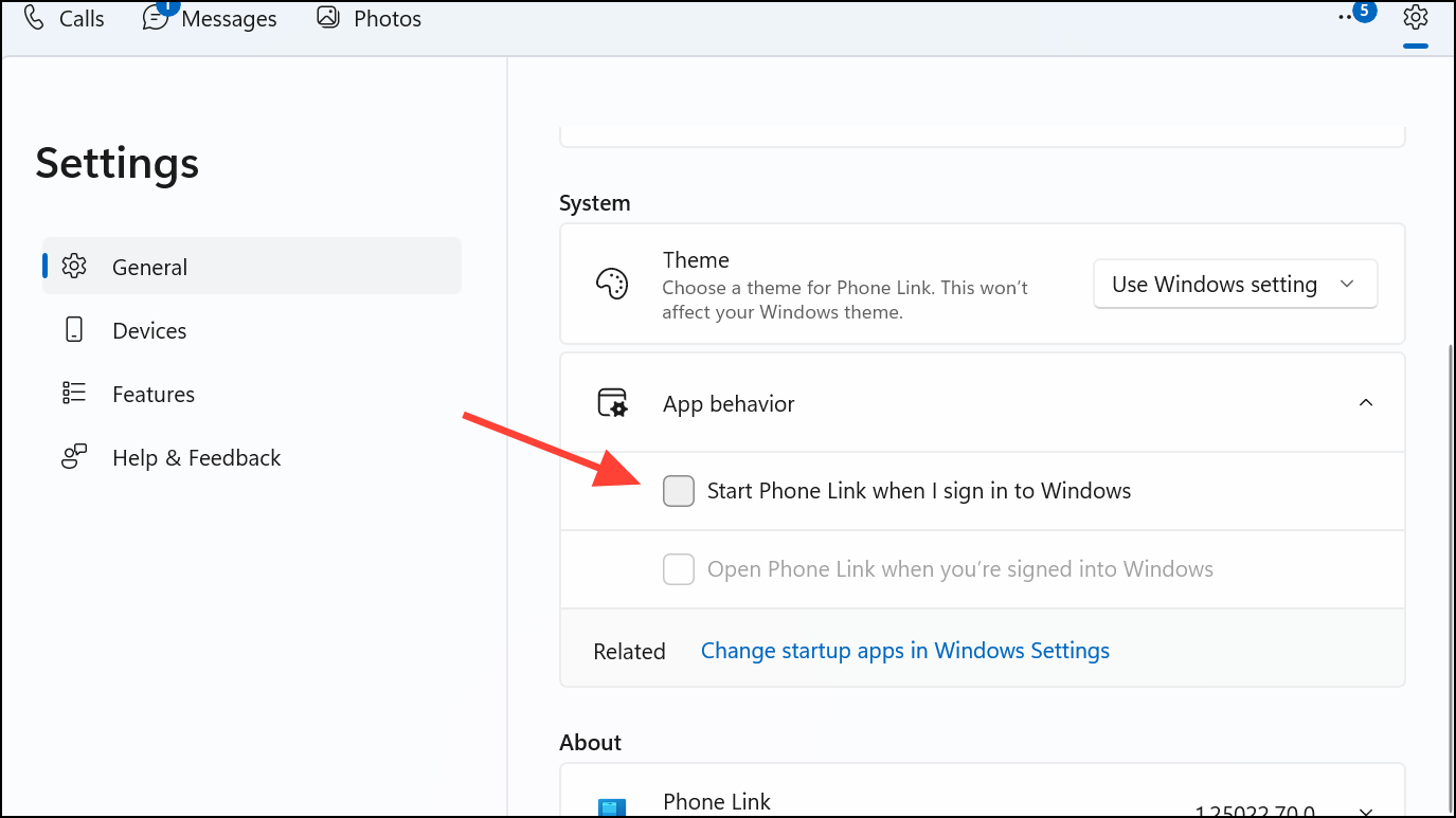 Step 4: Uncheck the box labeled "Start Phone Link when I sign in to Windows."