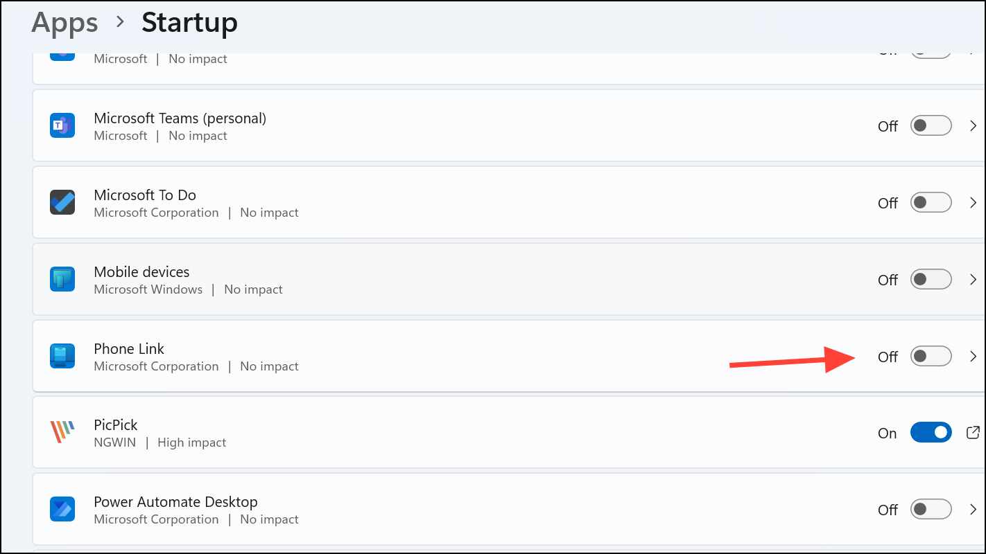 Step 3: Find "Phone Link" in the list of startup apps and toggle it off.