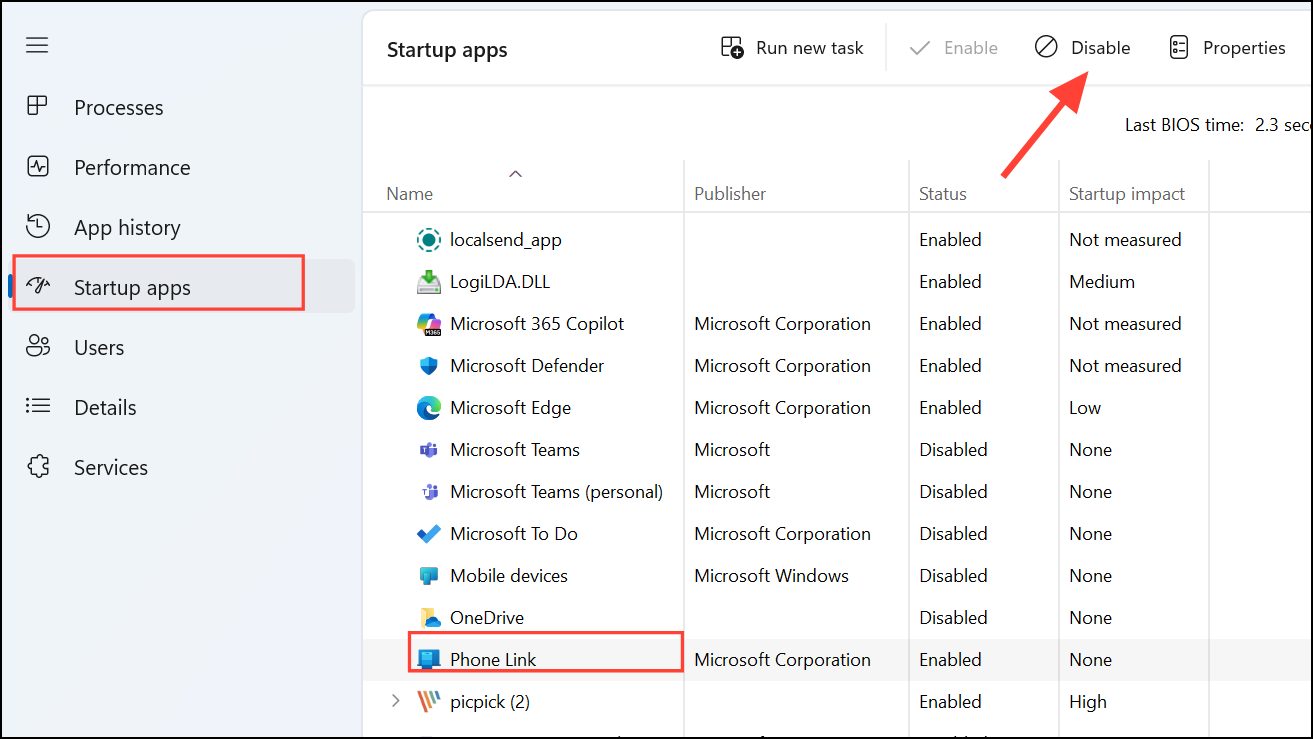 If Phone Link doesn't appear in the Startup apps list, you can disable it directly from Task Manager: