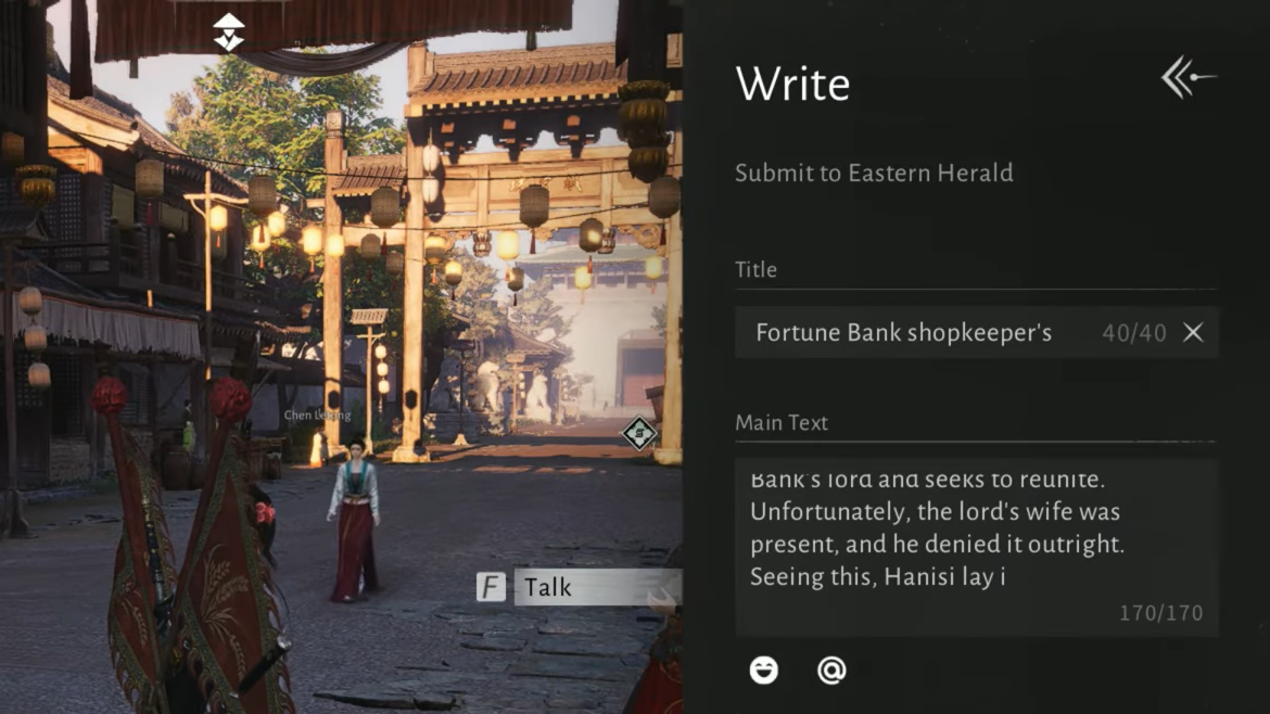 The Eastern Herald is a Jianghu newspaper founded by Du Gantang. After unlocking it through the Correspondent: Eastern Herald quest, you can write articles of your own and submit them publicly. Other players can view and like your articles, similar to the signpost system.