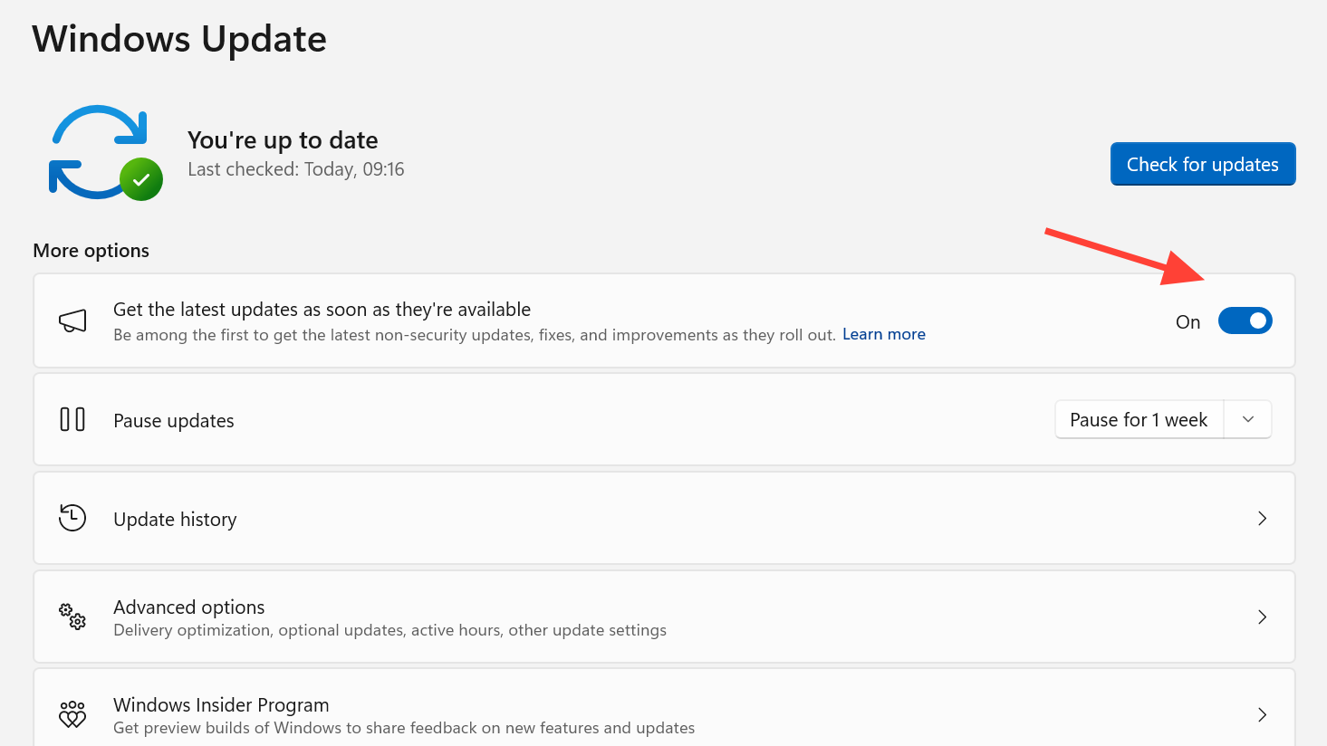 - If needed, enable Get the latest updates as soon as they’re available in Windows Update settings.