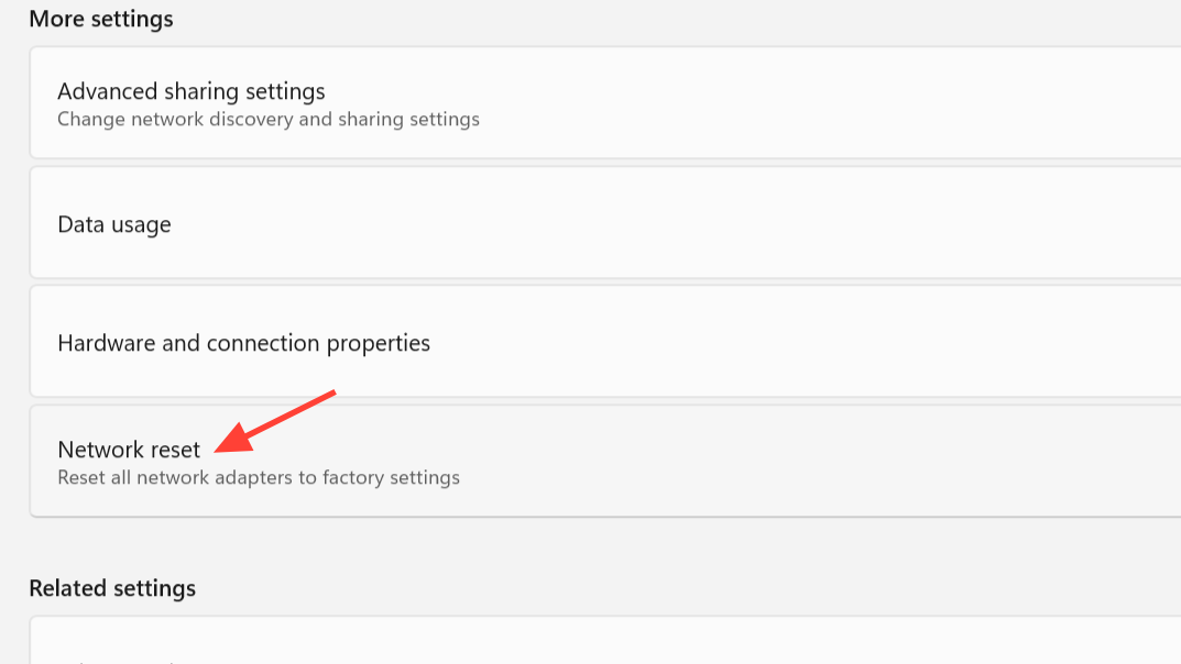 Open Settings with Windows + I, go to Network & internet, then open Advanced network settings. Scroll down and choose the option that resets network adapters and settings (labelled Network reset in many builds). Read the warning, then start the reset.