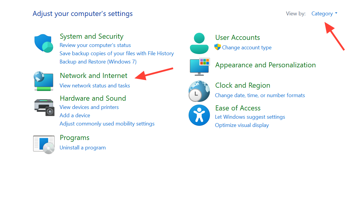 Press Windows + R, type control , and press Enter. In Control Panel, set View by: to Category, choose Network and Internet, then select Network and Sharing Center. If this path works, the previous icon you used is likely damaged; removing and recreating that shortcut is usually enough.