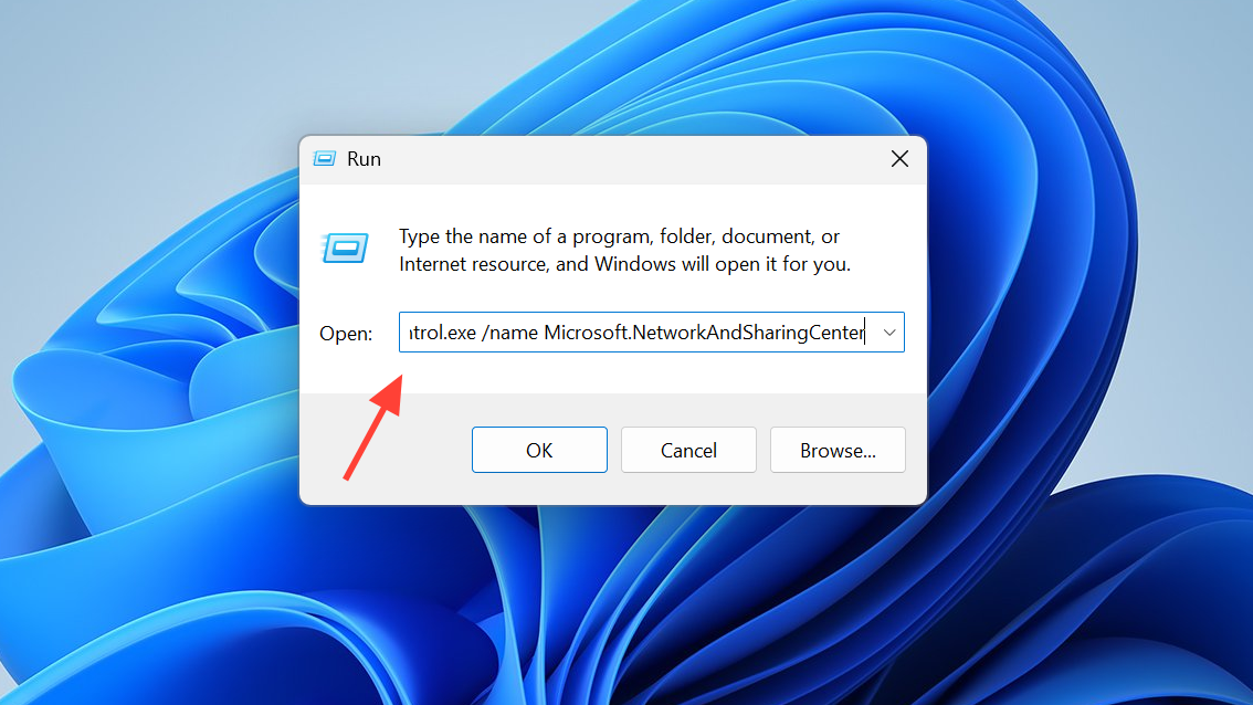 control.exe /name Microsoft.NetworkAndSharingCenterThen press Enter. This runs the Network and Sharing Center module directly. If this works but other methods do not, pin this run command or create a new shortcut using this target.