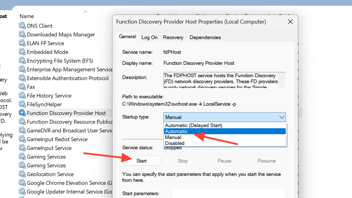 Find Function Discovery Provider Host, double‑click it, set Startup type to Automatic, then click Start if the service is stopped. This service helps other devices be found on the network.