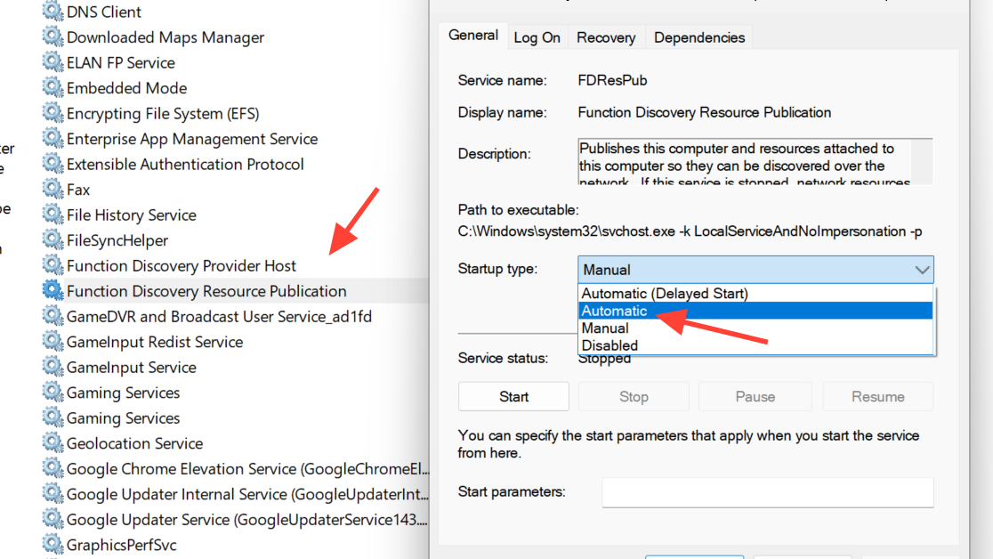 In the same list, open Function Discovery Resource Publication, set Startup type to Automatic, and start the service. This publishes your computer and its shares so other devices can see them.
