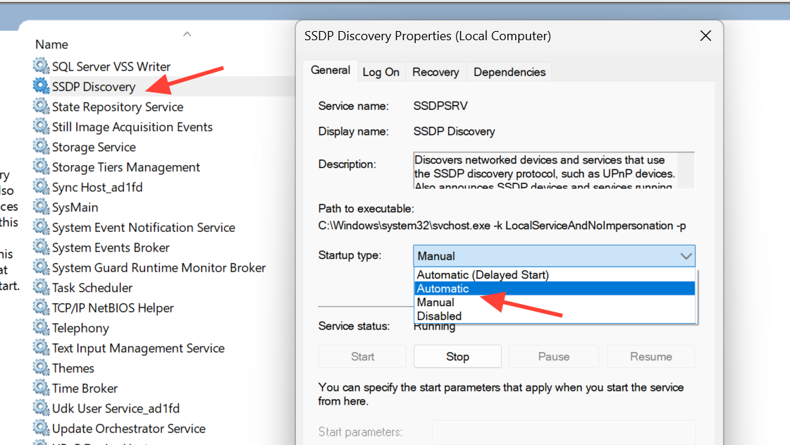 Locate SSDP Discovery, open it, choose Automatic for Startup type, then start the service. It helps Windows find UPnP devices and is frequently used during network discovery.