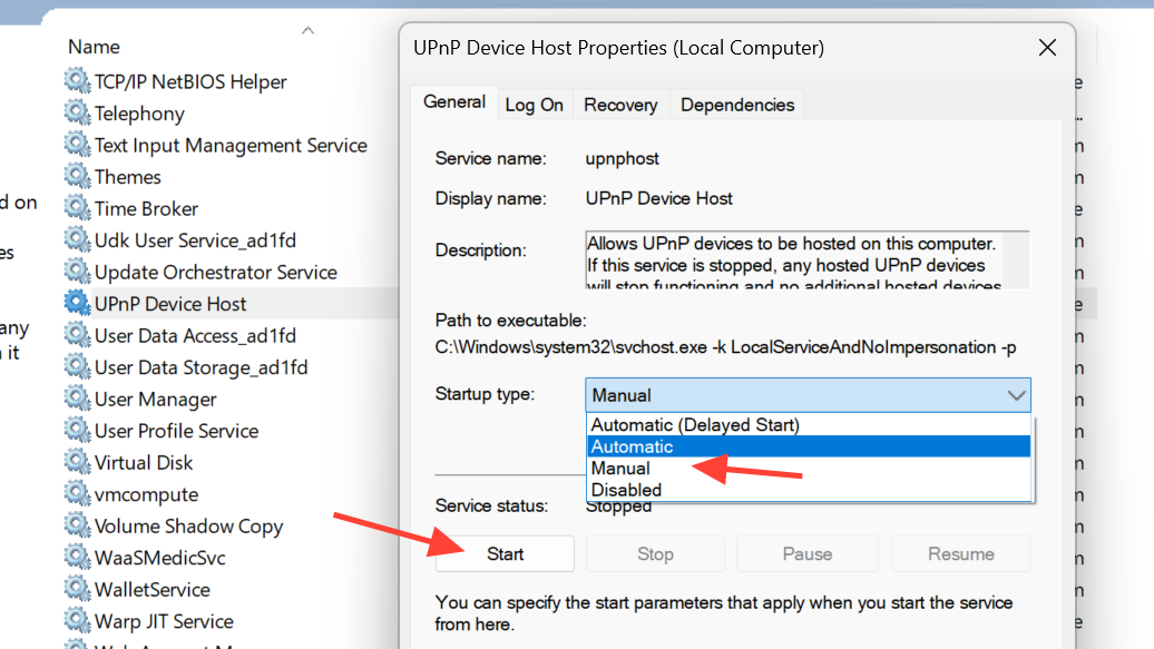 Open UPnP Device Host, set Startup type to Automatic, and start the service. While not strictly required for every network, missing UPnP services can cause device lists and discovery options to behave unpredictably.