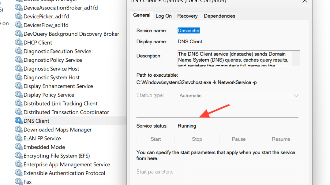 Step 6: Confirm DNS Client is running.