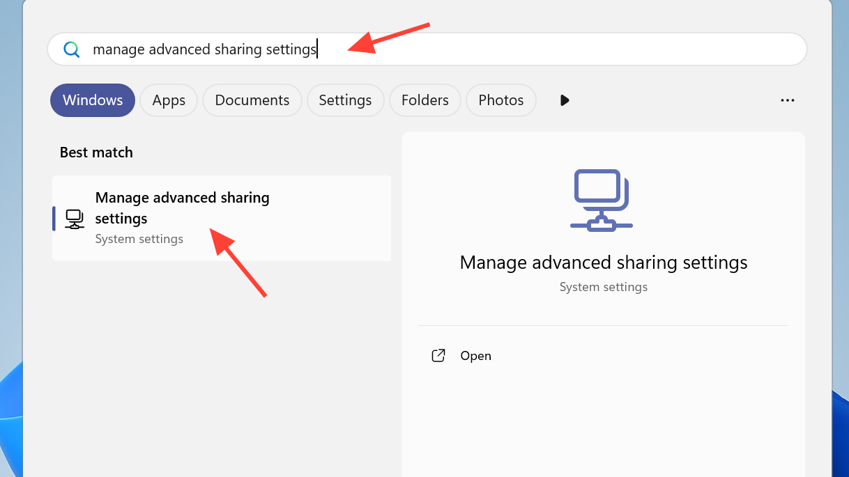 Press Windows + S, type Manage advanced sharing settings, and press Enter. This opens the sharing options that control discovery and file sharing on each network profile.
